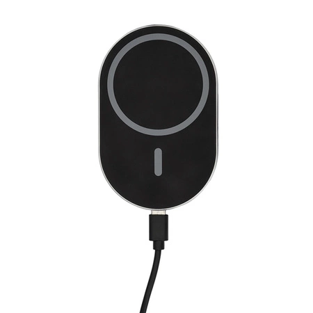 Bezprzewodowa ładowarka samochodowa 15W. Ładowarka posiada uniwersalne mocowanie pasujące do otworów wentylacyjnych w samochodzie. Kompatybilna z telefonami z technologią MagSafe. Zawiera dodatkowy metalowy pierścień do obsługi ładowania innych niemagnetycznych telefonów bezprzewodowego ładowania.