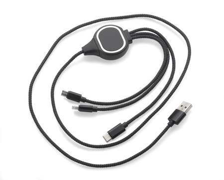 Kabel LUX to doskonały gadżet reklamowy z wygrawerowanym logo, które podświetla się po podłączeniu. Kabel 3w1 (micro USB, USB-C, Lightning) o długości 1m, wykonany z wytrzymałego materiału. Idealny do ładowania.