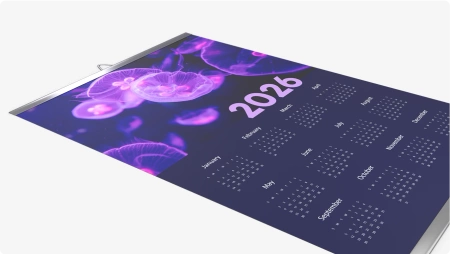 Kalendarz wzmocniony jest dwiema metalowymi listwami, które zapobiegają zwijaniu się papieru i zapewniają mu trwałość nawet w pomieszczeniach o większej wilgotności. Listwy mogą być montowane po krótszym lub dłuższym boku, w zależności od projektu. Dostępne są w trzech kolorach: białym, czarnym i srebrnym. Górna listwa wyposażona jest w zawieszkę – trójkątną lub okrągłą – co umożliwia wygodne powieszenie kalendarza. Dzięki dużej powierzchni nadruku możesz umieścić na nim logo, hasło reklamowe lub pełnowymiarową grafikę promującą Twoją firmę.