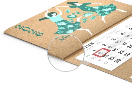 - Ekologiczne kalendarze trójdzielne drukowane na papierze Kraftliner z indywidualnym projektem. Wersje od ekonomicznej z płaską główką po wersje z główką wypukłą i piankowaną.