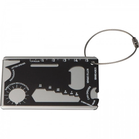 Karta survivalowa wykonana z aluminium. Zawiera: linijkę, otwieracz do butelek, otwieracz do puszek, śrubokręt, Logotyp można umieścić bezpośrednio na produkcie.