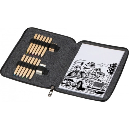 Zestaw w filcowym etui, składający się z 12 kolorowych kredek, gumki do mazania, temperówki i bloczku z kolorowankami z 50 różnymi obrazkami.