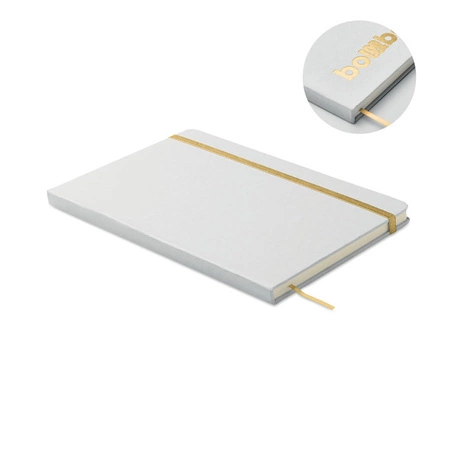 - Notatnik A5 z twardą okładką wykonany w 70% z kartonu po mleku i w 30% z papieru z recyklingu. Białą okładka w kartonowej oprawie . 160 stron w linie (80 kartek). Gumka zamykająca, wstążkowa zakładka dopasowana do uwidocznionego koloru. Po grawerowaniu la