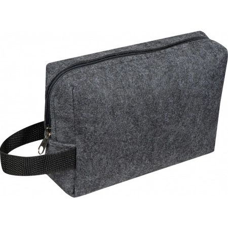 - Kosmetyczka wykonana z filcu RPET, zamykana na zamek, z uchwytem do przenoszenia.