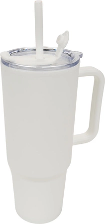 Kubek XXL, o pojemności 1200 ml, z podwójnymi ściankami, uchwytem do przenoszenia i słomką do picia.