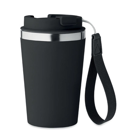 - Kubek z podwójnymi ściankami z recyklingowanej stali nierdzewnej (90% recyklingowanej stali nierdzewnej i 10% stali nierdzewnej) z zewnętrzną warstwą z PP i paskiem na nadgarstek z RPET. Pojemność: 350 ml.