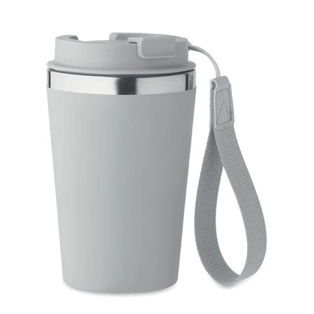 Kubek z podwójnymi ściankami z recyklingowanej stali nierdzewnej (90% recyklingowanej stali nierdzewnej i 10% stali nierdzewnej) z zewnętrzną warstwą z PP i paskiem na nadgarstek z RPET. Pojemność: 350 ml.