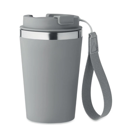 Kubek z podwójnymi ściankami z recyklingowanej stali nierdzewnej (90% recyklingowanej stali nierdzewnej i 10% stali nierdzewnej) z zewnętrzną warstwą z PP i paskiem na nadgarstek z RPET. Pojemność: 350 ml.