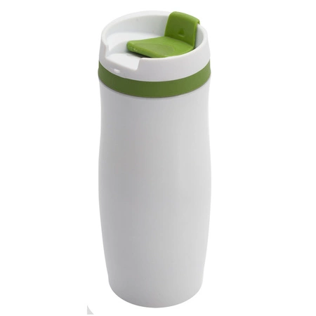 Kubek izotermiczny – o pojemności 390 ml z dwiema ściankami ze stali nierdzewnej, zewnętrzna pokryta lakierem. Wewnętrzna ścianka wykonana ze stali o podwyższonej jakości 18/8. Podstawa kubka z wodoodpornej gumy termoplastycznej TPR. Zamknięcie typu flip up sip. Utrzymuje ciepło do 7 godzin.
