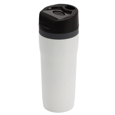 Szczelny kubek izotermiczny - termos o pojemności 350 ml. Dwie ścianki ze stali nierdzewnej, wewnątrz stal 18/8 o podwyższonej jakości. Rozkręcana pokrywka umożliwiająca jej dokładne umycie. Szczelne zamknięcie - leak proof zapobiega wyciekaniu płynów. Próżnia między ściankami kubka zapewnia parametry termosu. Zamknięcie typu open/close. Podstawa kubka z wodoodpornej gumy termoplastycznej TPR. Utrzymuje ciepło do 12 godzin. Możliwość dobrania dodatkowej opaski R00001.