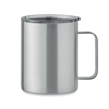 - Dwuścienny kubek ze stali nierdzewnej z recyklingu (90% recyklingowanej stali nierdzewnej i 10% stali nierdzewnej) z pokrywką z zasuwanym otworem do picia. Pojemność: 300 ml.