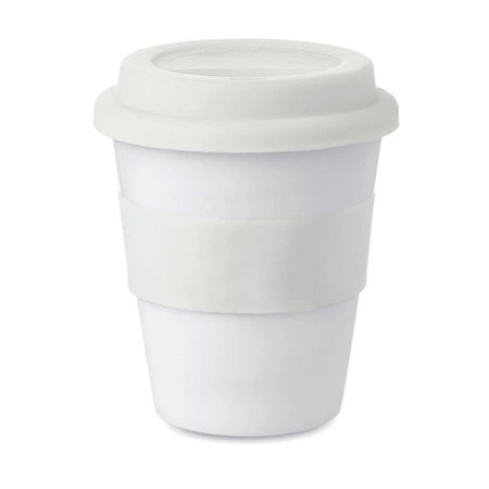 - Kubek z pojedynczą ścianką, z białego połyskującego PP z silikonową pokrywą i pierścieniem na środku. Pojemność 350ml. Kubek jest jednowarstwowy, nagrzewa się z zewnątrz.