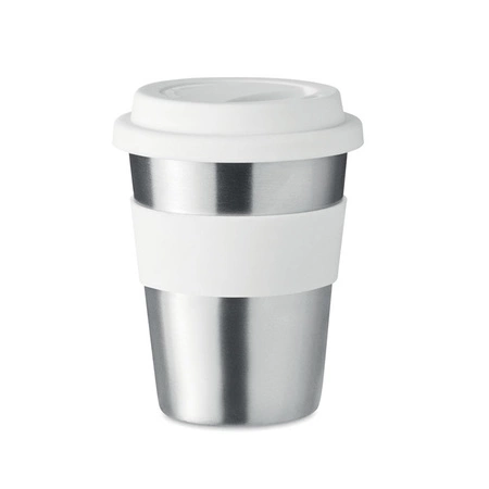 - Jednościenny kubek ze stali nierdzewnej z silikonową pokrywką i uchwytem. Pojemność 350 ml. Ponieważ jest to kubek z pojedynczą ścianką, może dochodzić do wymiany ciepła.