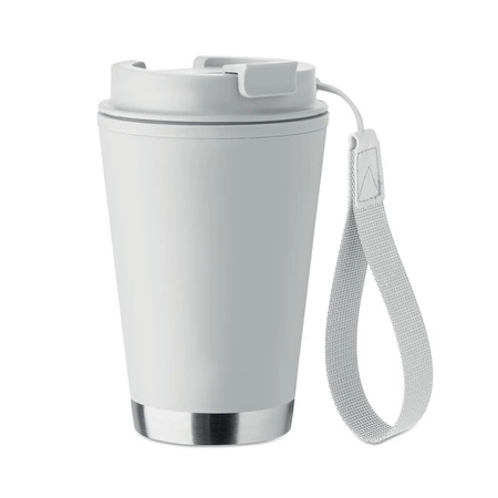 - Dwuścienny kubek z wewnętrzną ścianką z PP, zewnętrzną ścianką z PP pochodzącego z recyklingu, detalami ze stali nierdzewnej pochodzącej z recyklingu i paskiem na nadgarstek z RPET. Pojemność: 300 ml.