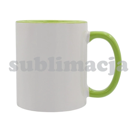 Kubek ceramiczny o pojemności 330 ml, przygotowany pod nadruk sublimacyjny, z kolorowym uchwytem i wnętrzem.