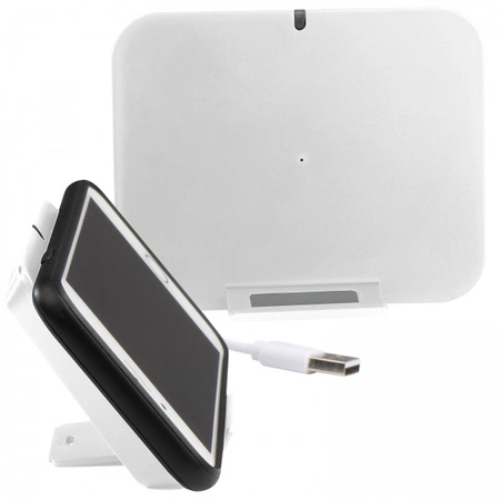 - Ładowarka indukcyjna (QI standard) z plastiku. Może służyć także jako stojak na telefon. Kabel micro USB w zestawie. Moc wejściowa: 5V/2A, moc wyjściowa 5V/1A.