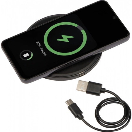 Ładowarka bezprzewodowa z fukcją szybkiego ładowania (10 watt) i ledowym wyświetlaczem. Gdy ładowarka jest gotowa do ładowania podświetla się na zielono, podczas ładowania światełko zmienia się na niebieskie.