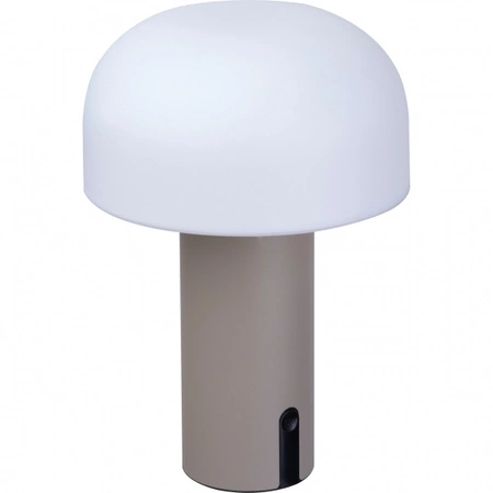 Lampka z kloszem z tworzywa sztucznego i podstawą ze stali nierdzewnej, wyposażona w kabel do ładowania USB-C o długości 70 cm.