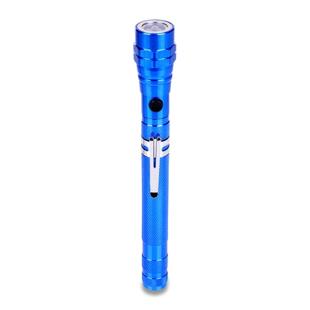 - Metalowa wysuwana latarka. Teleskop o długości 38,5 centymetrach Wyposażona w 3 białe diody LED, o sumarycznym strumieniu światła 10 lumenów. Zaopatrzona w klips oraz magnesy na obu końcach. Zasilana 4 bateriami typu AG13 (w cenie produktu).