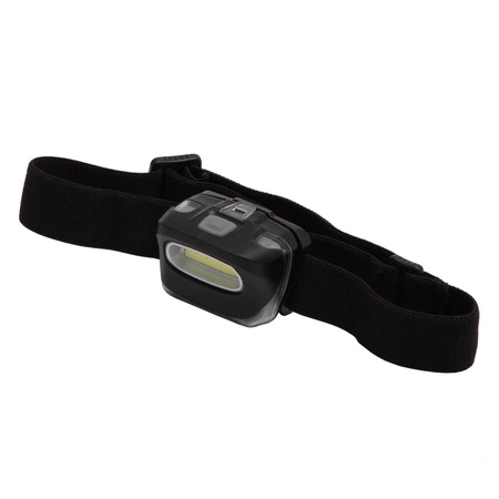 Latarka czołowa o strumieniu światła 100 lumenów. Dioda 3 W z wykorzystaniem technologii COB. Regulowany pasek na głowę/czapkę/kask. Regulowany kąt nachylenia latarki w zakresie 18-20 stopni. Zasilana 3 bateriami typu AAA (dołączone). Żywotność LED 100 000 godz. Zasięg 80 metrów.