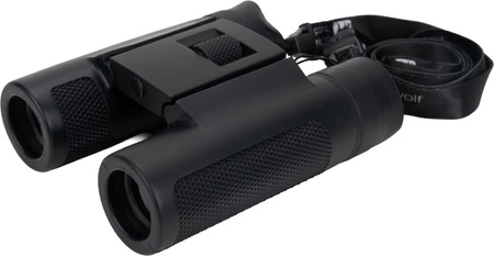 Lornetka Schwarzwolf o powiększeniu 10x i średnicy obiektywu 25mm, pole widzenia na 1000 m: 101 m, kąt widzenia 5,8°, średnia źrenica wyjściowa to 11 mm, minimalna odległość ostrzenia to 3 m. Lornetka zapakowana w neoprenowy futerał z paskiem na szyję.