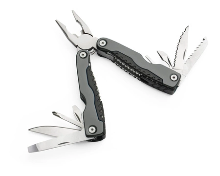 - Metalowe narzędzie wielofunkcyjne z kompletem podstawowych funkcji: kombinerki, piła do drewna, otwieracze, pilnik, śrubokręty i nożyki. Personalizacja logo na narzędziu.