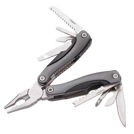 Narzędzie 9-funkcyjne pakowane w poliestrowe etui. Ostrza wykonane ze stali nierdzewnej. Narzędzie zawiera: piłę, wkrętaki płaskie, otwieracz do konserw, pilnik, szczypce uniwersalne, skrobak do ryb z końcówką do haczyków wędkarskich, otwieracz do butelek, wkrętak PH krzyżakowy, nóż.