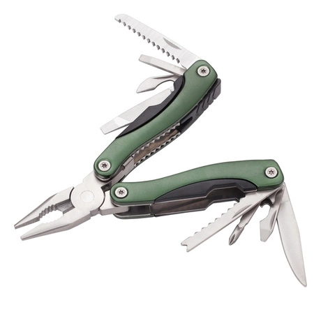 Narzędzie 9-funkcyjne pakowane w poliestrowe etui. Ostrza wykonane ze stali nierdzewnej. Narzędzie zawiera: piłę, wkrętaki płaskie, otwieracz do konserw, pilnik, szczypce uniwersalne, skrobak do ryb z końcówką do haczyków wędkarskich, otwieracz do butelek, wkrętak PH krzyżakowy, nóż.