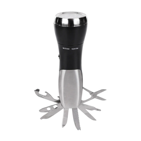12 - funkcyjne narzędzie z latarką o strumieniu światła 20 lm. 4 białe dody LED i 1 czerwona z migającym światłem ostrzegawczym. Zawiera: latarka LED, nożyczki, skrobak do ryb, końcówka do haczyków wędkarskich, wkrętak krzyżowy, piła, wkrętaki płaskie, otwieracz do konserw, otwieracz do butelek, nóż, pilnik, klucze oczkowe.