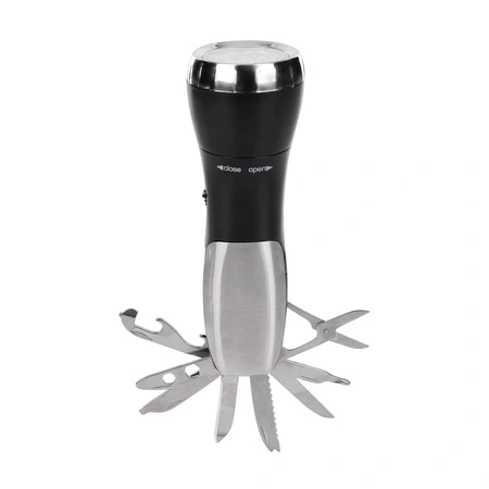 - 12-funkcyjne narzędzie z latarką o strumieniu światła 20 lm. 4 białe dody LED i 1 czerwona z migającym światłem ostrzegawczym. Zawiera: latarka LED, nożyczki, skrobak do ryb, końcówka do haczyków wędkarskich, wkrętak krzyżowy, piła, wkrętaki płaskie, ot
