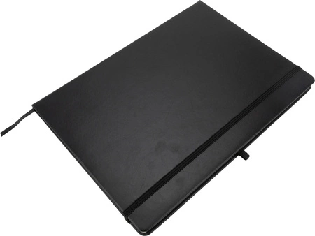 - Notes A4 w linie (80 kartek) z okładką z tworzywa sztucznego, zakładką i miejscem na długopis. Zamykany na gumkę.