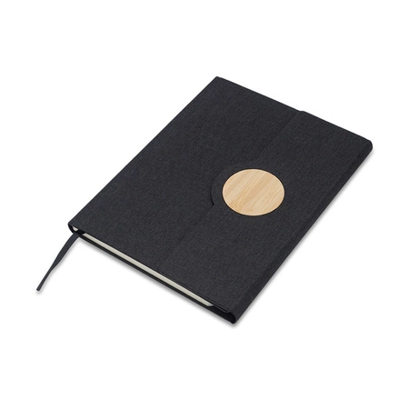 Elegancki notes w linie ( 80 arkuszy 70 g/m²) w twardej oprawie z tkaniny RPET, ozdobiony bambusowym elementem. Posiada uchwyt na długopis. Zamykany na magnetyczne zapięcie.