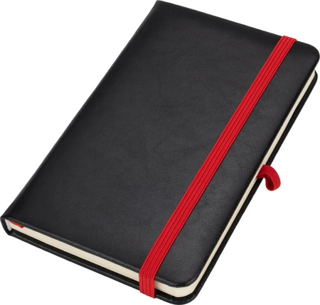 - Notatnik A6 w okładce ze skóry syntetycznej, ze 160 stronami w linie, zakładką, pętelką na długopis i gumką do zamykania.