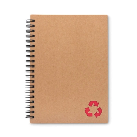 - Notatnik z okładką z kartonu z recyklingu. Podwójna spirala. 140 stron w linie z papieru mineralnego (70 arkuszy). Papier mineralny jest wykonany z węglanu wapnia i HDPE (żywicy polietylenowej) stosowanej jako spoiwo. Jest wodoodporny i odporny na tłuszc