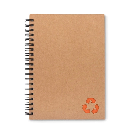 Notatnik z okładką z kartonu z recyklingu. Podwójna spirala. 140 stron w linie z papieru mineralnego (70 arkuszy). Papier mineralny jest wykonany z węglanu wapnia i HDPE (żywicy polietylenowej) stosowanej jako spoiwo. Jest wodoodporny i odporny na tłuszc