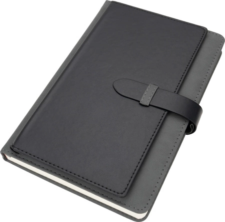 - Notatnik A5 w okładce z PU, ze 128 kartkami w linie, miejscem na długopis i wizytownikiem na 5 wizytówek.
