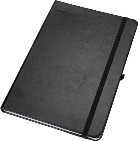 Notes o formacie A5, z okładką wykonaną z PU pochodzącego z recyklingu, posiada 192 strony w linie, zamknięcie na gumkę, materiałową zakładkę i pętelkę na długopis.