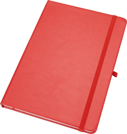 Notes o formacie A5, z okładką wykonaną z PU pochodzącego z recyklingu, posiada 192 strony w linie, zamknięcie na gumkę, materiałową zakładkę i pętelkę na długopis.