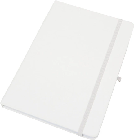 Notes o formacie A5, z okładką wykonaną z PU pochodzącego z recyklingu, posiada 192 strony w linie, zamknięcie na gumkę, materiałową zakładkę i pętelkę na długopis.