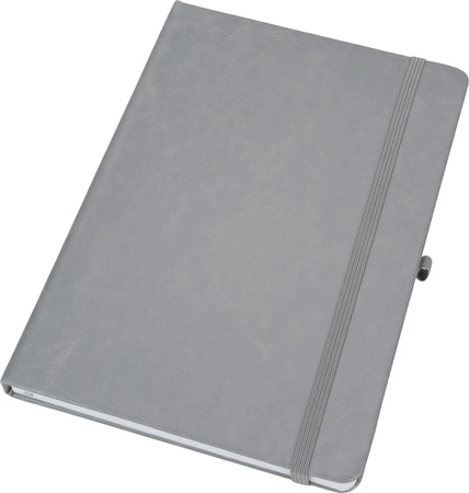 Notes o formacie A5, z okładką wykonaną z PU pochodzącego z recyklingu, posiada 192 strony w linie, zamknięcie na gumkę, materiałową zakładkę i pętelkę na długopis.