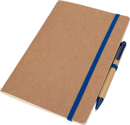 Notes o formacie A5, wykonany z papieru pochodzącego z recyklingu, posiada 120 stron w linie, zamknięcie na gumkę i długopis z niebieskim wkładem.