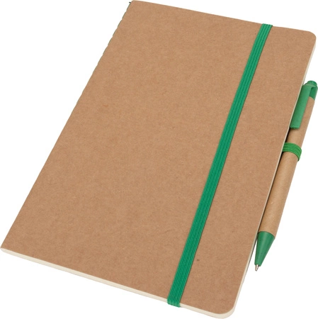 Notes o formacie A5, wykonany z papieru pochodzącego z recyklingu, posiada 120 stron w linie, zamknięcie na gumkę i długopis z niebieskim wkładem.