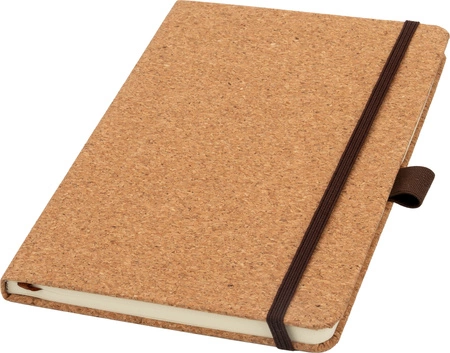 - Notatnik A5 w oprawie korkowej ze 80 kartkami w kropki, elastycznym paskiem, pętelką na długopis oraz długopisem z pszenicy i z powłoką z korka.