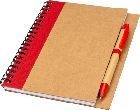 - Notes z 80 kartkami z papieru z recyklingu, w tekturowej okładce na spiralce z dopasowanym długopisem piszącym na niebiesko.