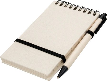- Notes wykonany z kartonu po mleku, ze 140 stronami w linię, zamknięciem na gumkę, i długopisem z niebieskim wkładem.