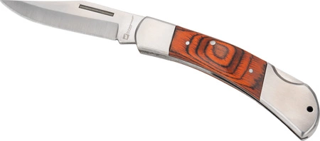 - Składany nóż wykonany ze stali nierdzewnej, z drewnianą rękojeścią i blokadą bezpieczeństwa.