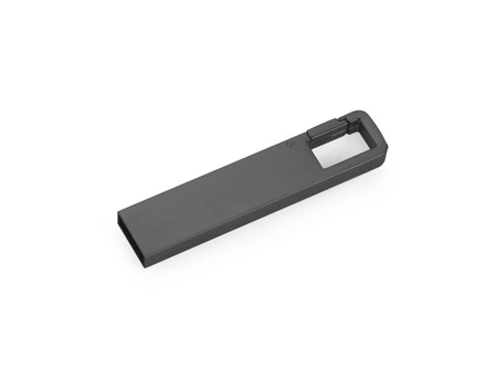 Przenośna pamięć USB 16 GB z metalu z karabińczykiem. Standard USB 2.0, szybkość zapisu 4,5 MB/s, odczytu 12 MB/s. 5-letnia gwarancja producenta, certyfikat CE.