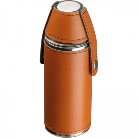 - Okrągła piersiówka wykonana ze stali nierdzewnej obita skórpodobnym materiałem PU, z dwoma kieliszkami. Piersiówka ma pojemność 230 ml, kieliszki każdy po 40 ml.