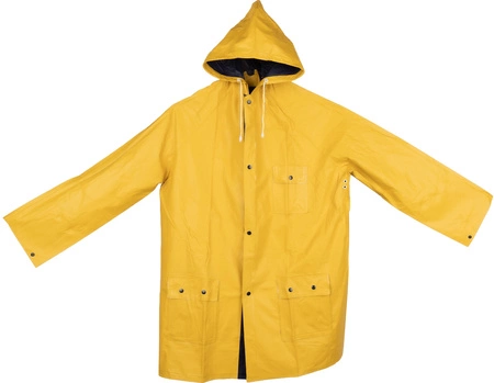 - Dwukolorowa, dwustronna kurtka przeciwdeszczowa XL, z PVC (bez ftalanów), z zatrzaskami i kapturem. Wymiary pleców kurtki 103 x 60 cm.