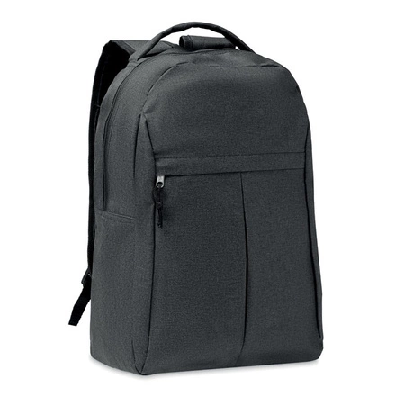 Plecak z poliestru 600D RPET melanż, z zewnętrzną kieszenią na zamek i kieszenią z siatki z boku.